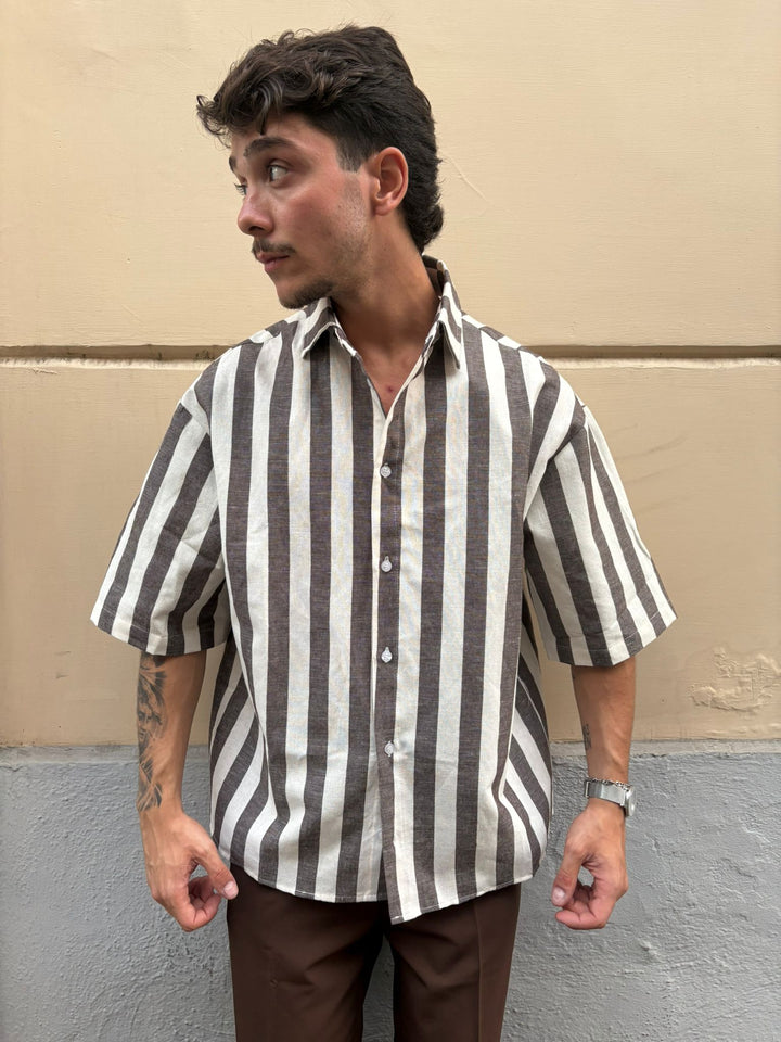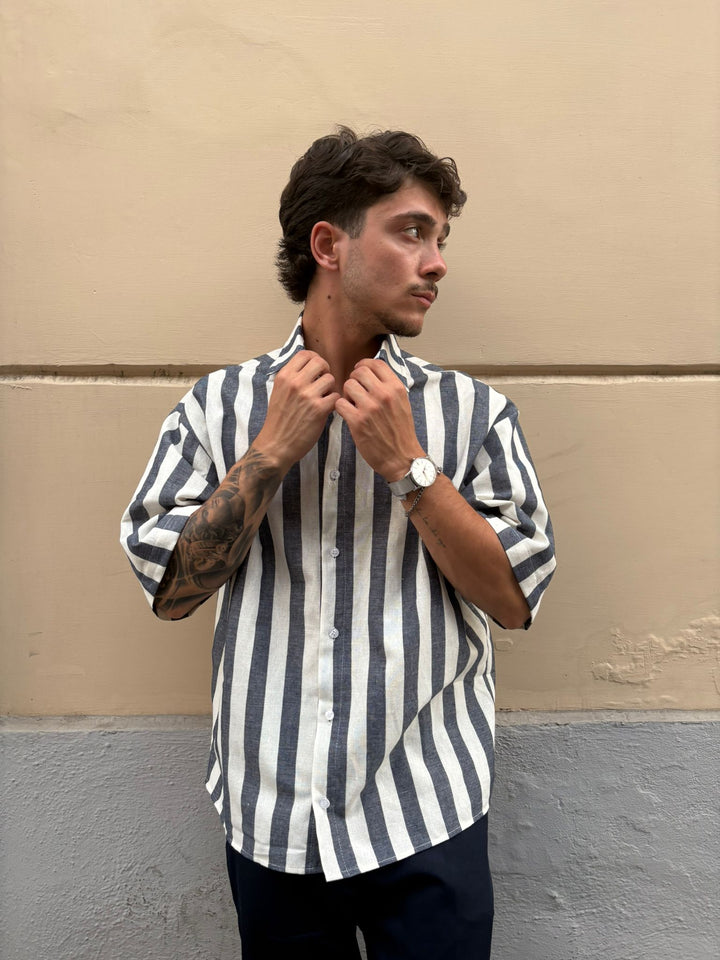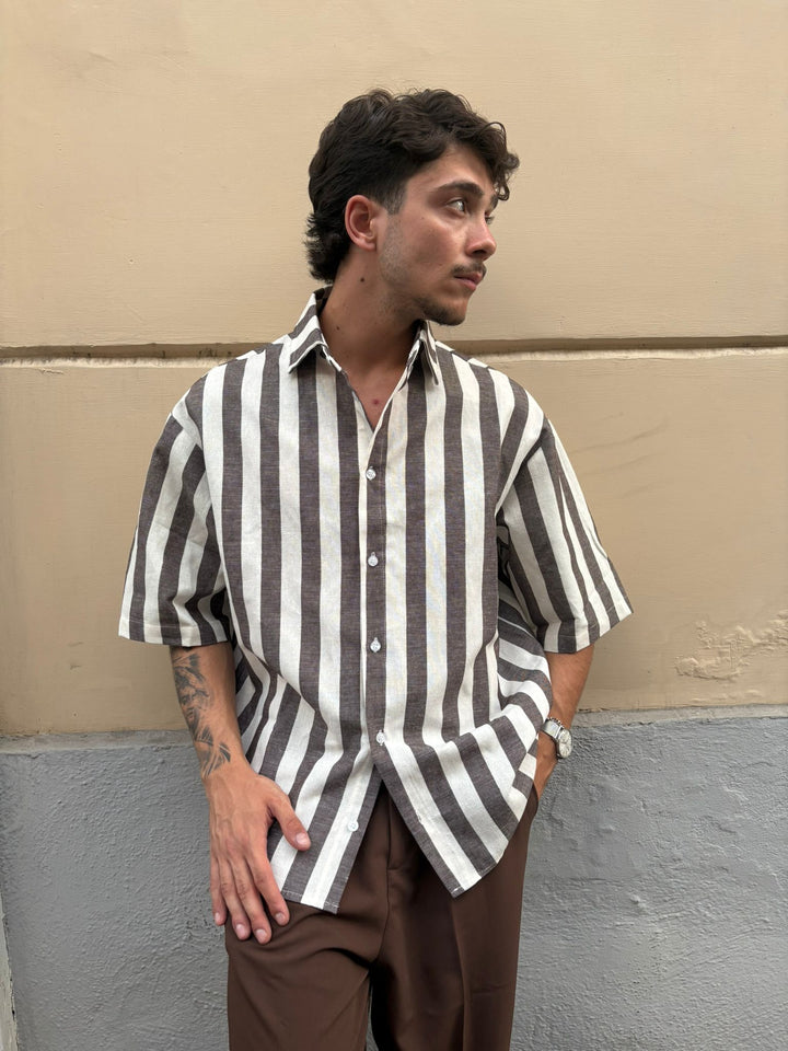 la camicia di lino a righe è disponibile in due varianti di colore , righe blu e righe marrone