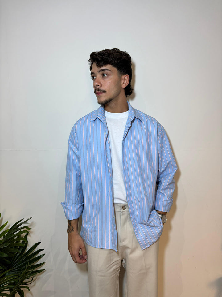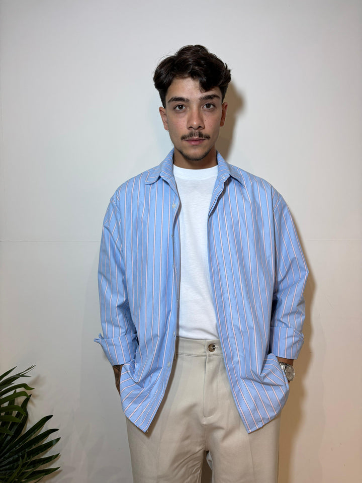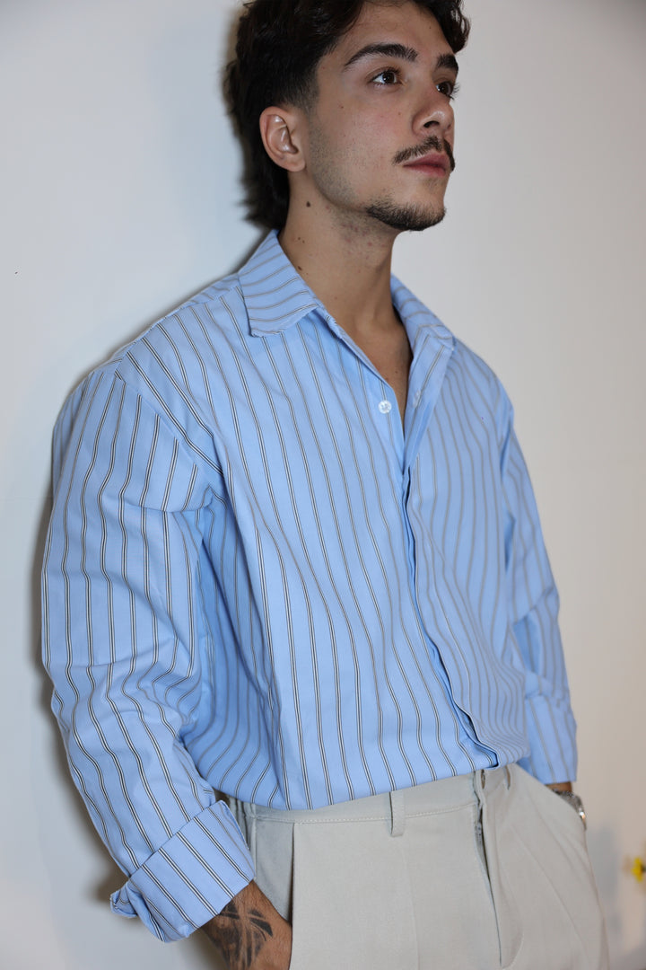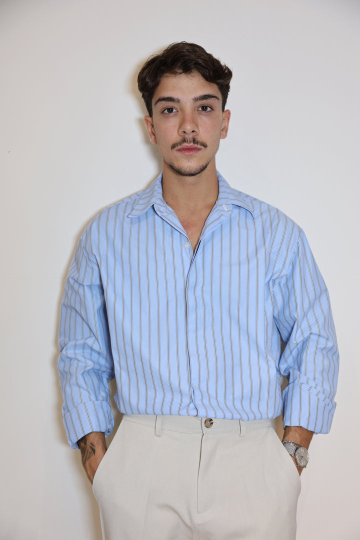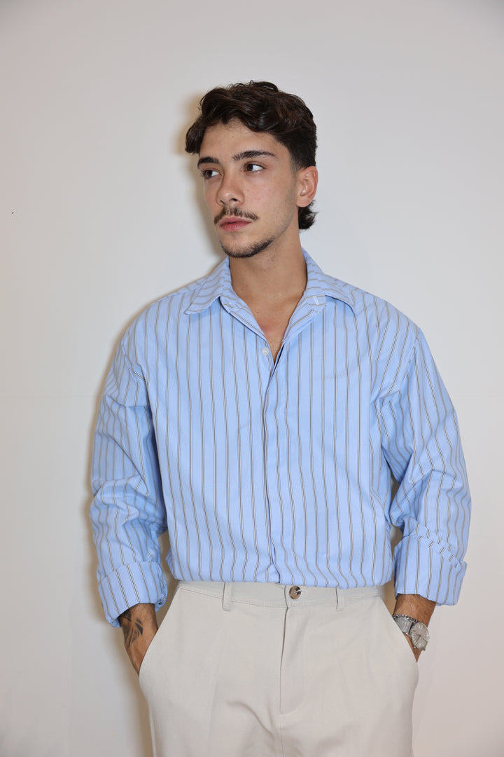 La camicia Posillipo è una camicia a righe, casual, per ogni occasione, vestibilità regolar, col particolarità del bottone a scomparsa, disponibile in due varianti colore
