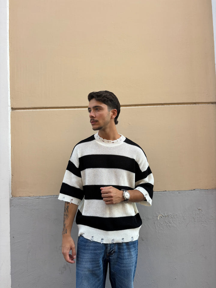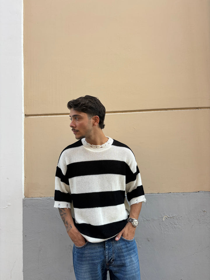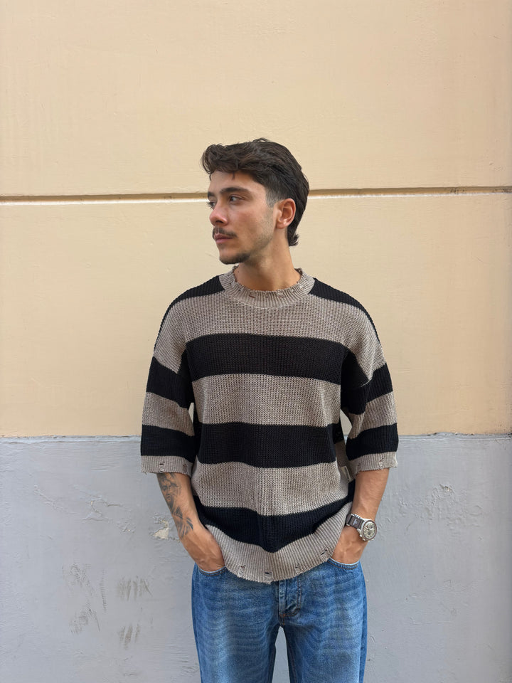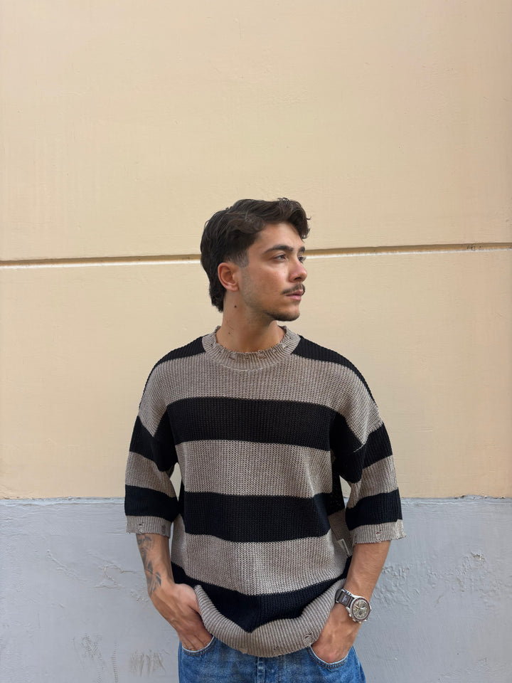 La maglia SCRAPS in filo si presenta con manica trequarti, lavorata con rotture e fasce ,in due variante di colore bianca e nera e marrone e nera