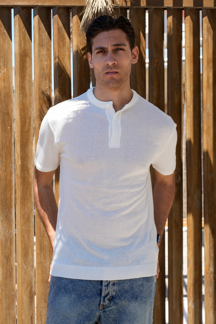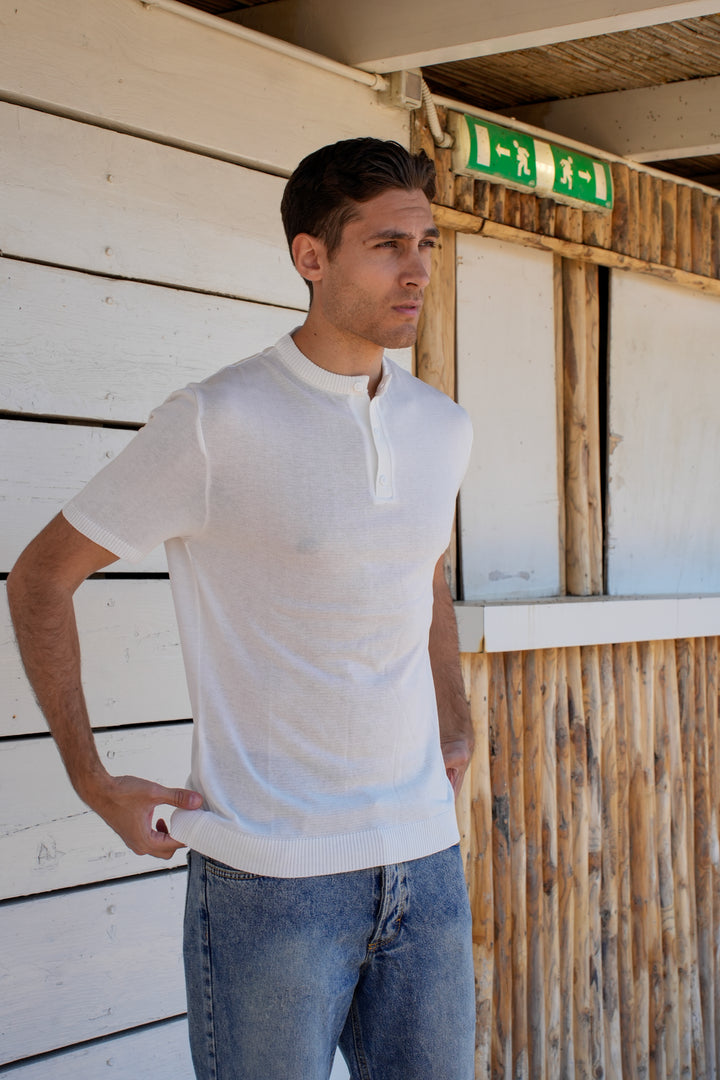 La maglia Serafilo si presenta in quattro varianti di colore , nero , blu , azzurro , bianco . La particolarità sta nel girocollo con il dettaglio dei tre bottoni tono su tono .