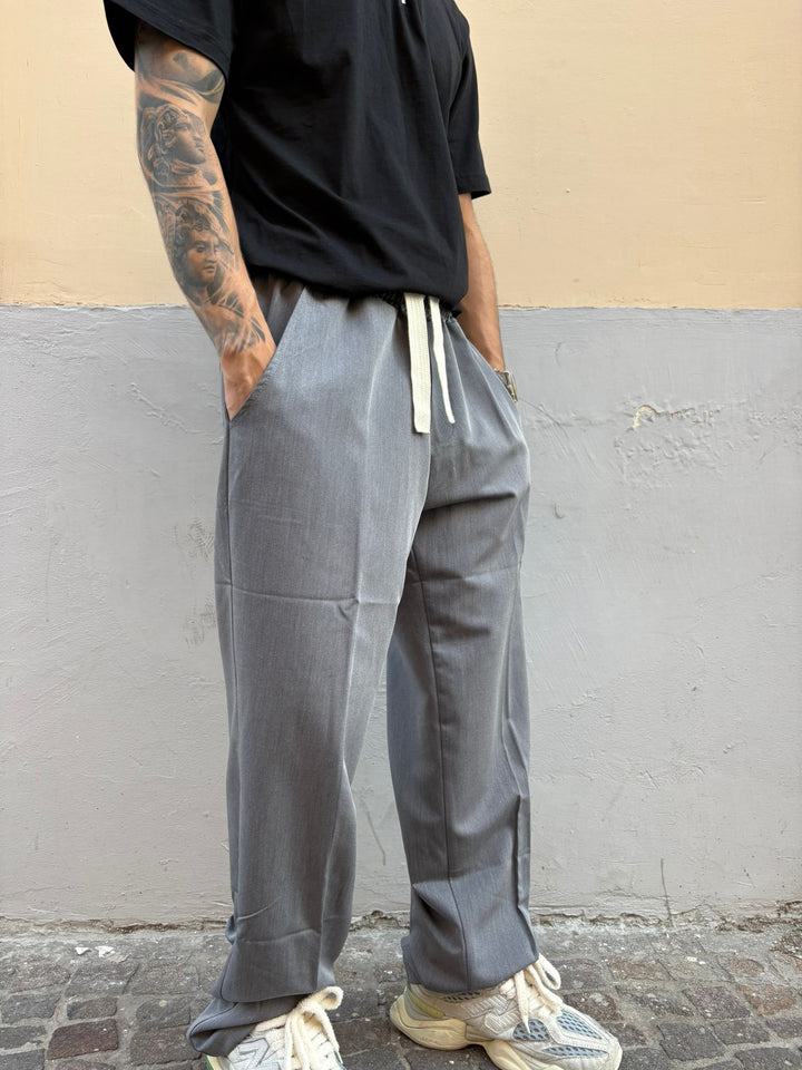 il pantalaccio taglio nobile è disponibile in una variane di colore grigio con particolarita' dei lacci in vita con fondo largo