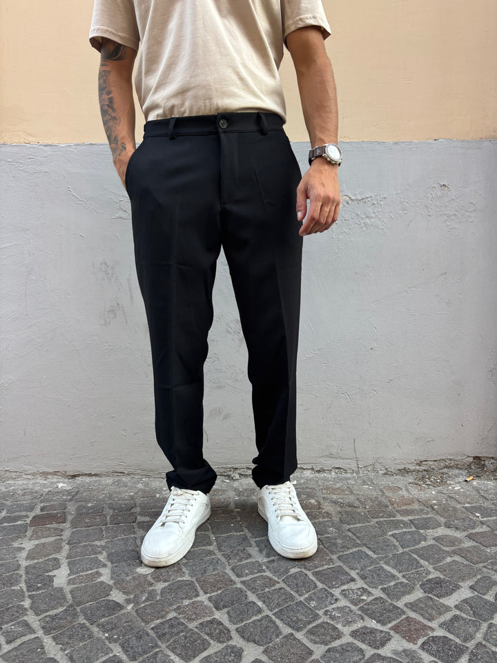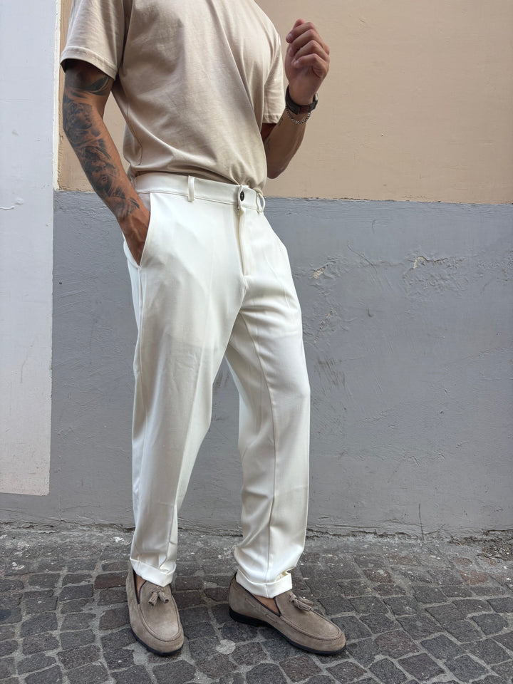 Io pantalone Capri si presenta con fondo Capri e con risvolto e tasca americana con due varianti di colore panna e nero