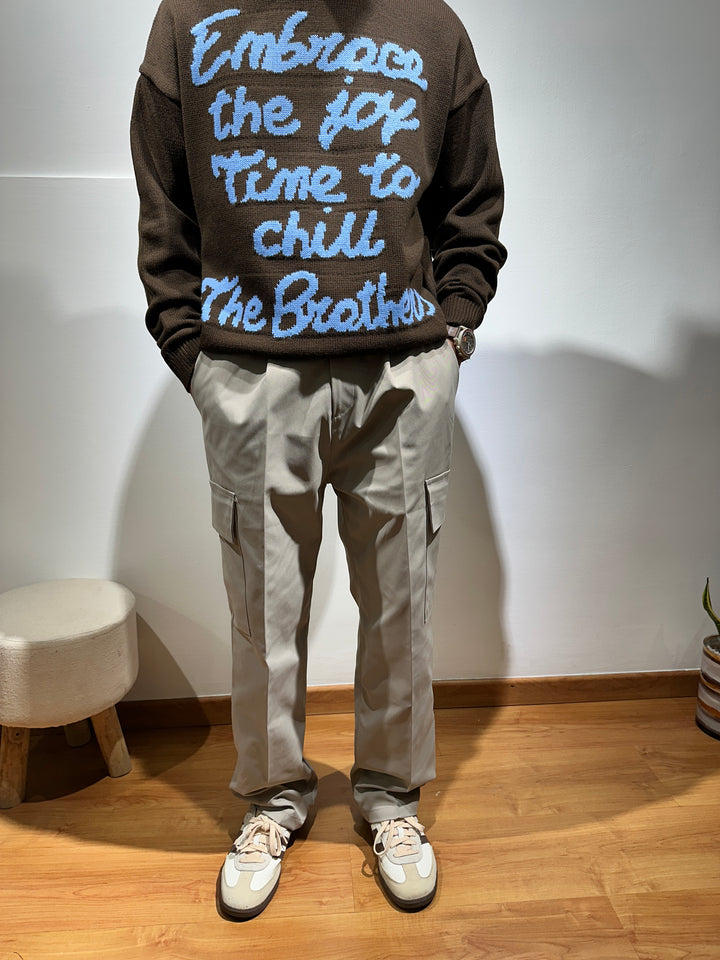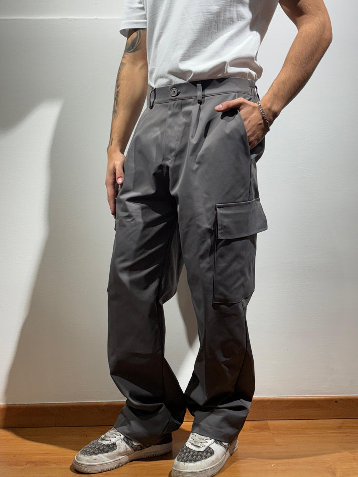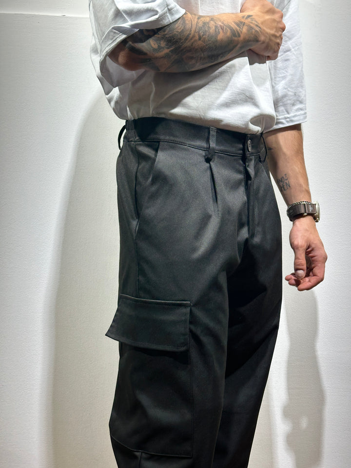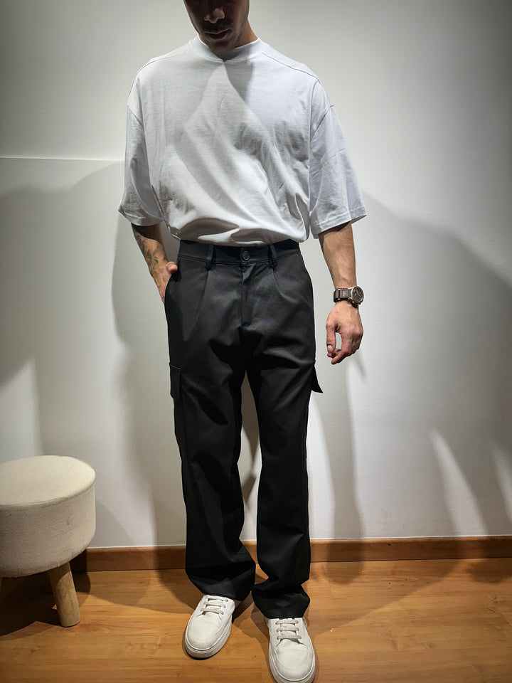 Il pantalone CARGO TECNICO è un pantalone fondo largo, in tessuto tecnico, vestibilità regolare, disponibile in due varianti di colore, beige e nero