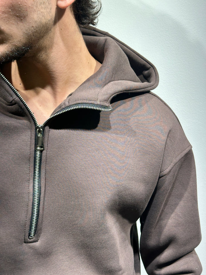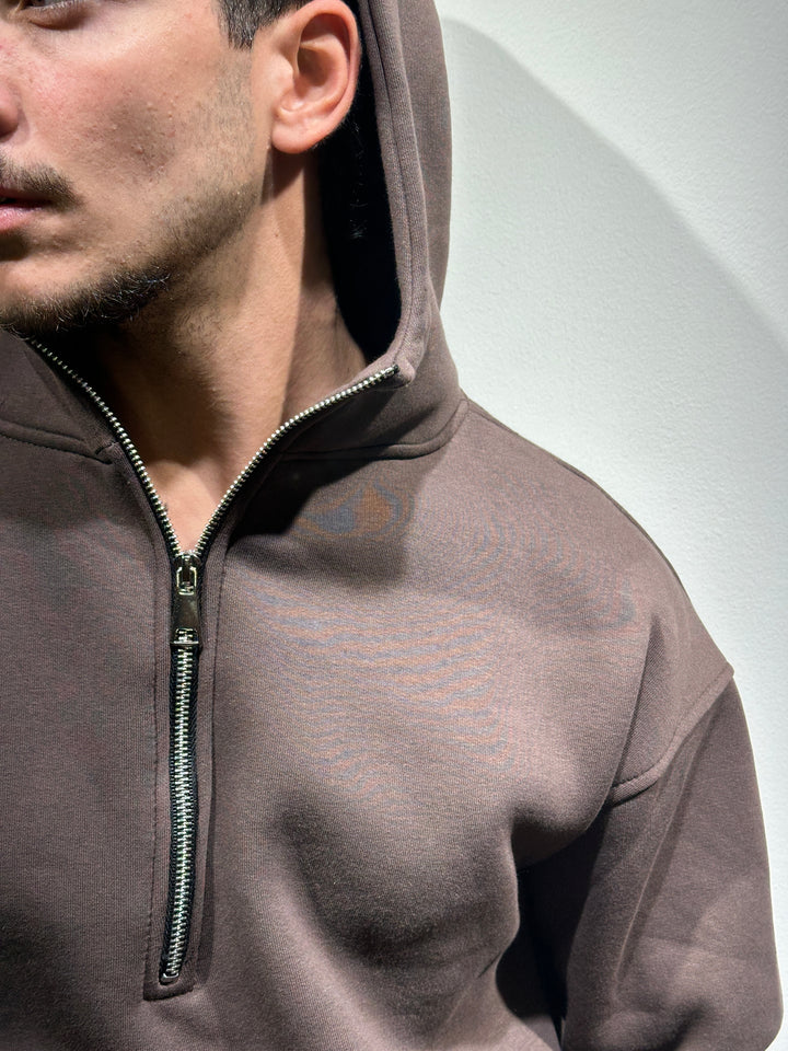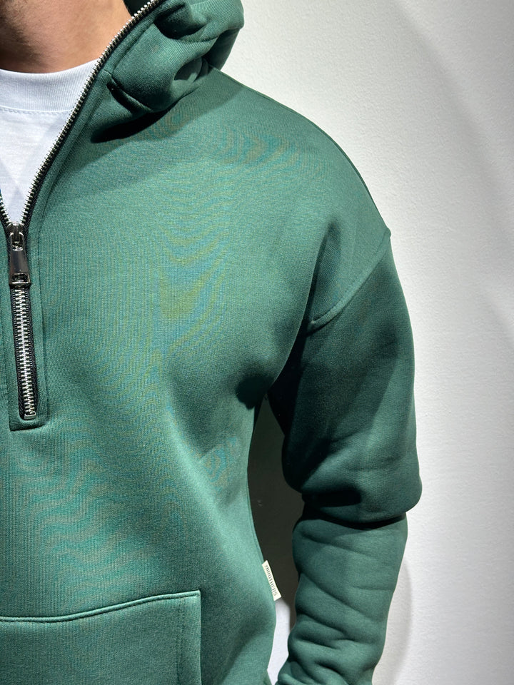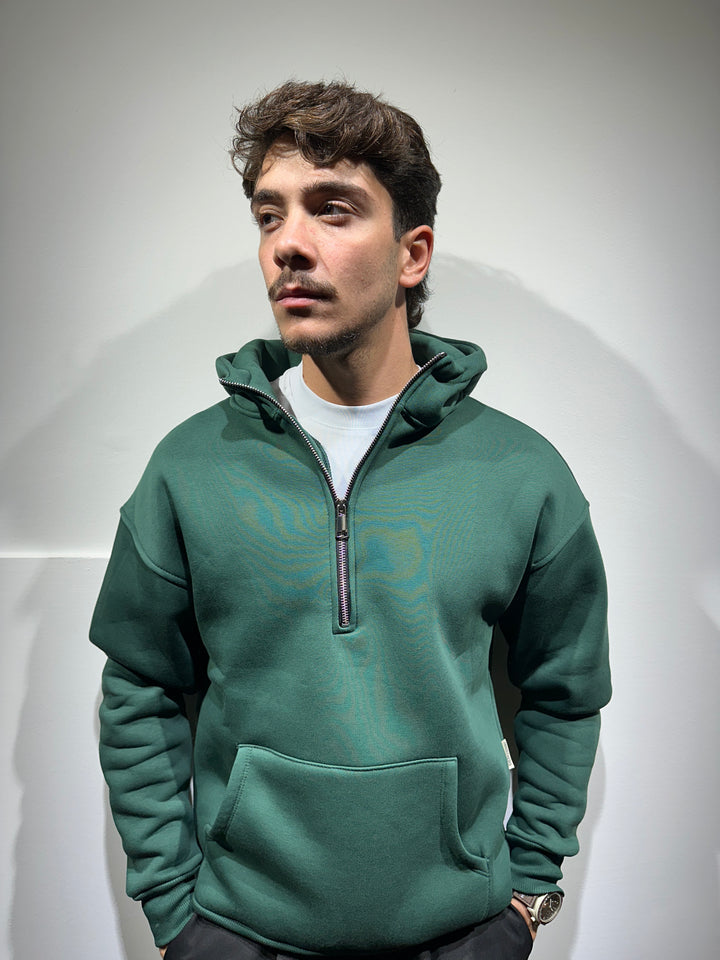 La felpa MEZZA ZIP, è una felpa vestibilità boxy fit con la particolarità della mezza zip, ideale per l’inverno, essendo molto pesante e coprente fino al collo, disponibile in due varianti di colore, moro e verde bottiglia